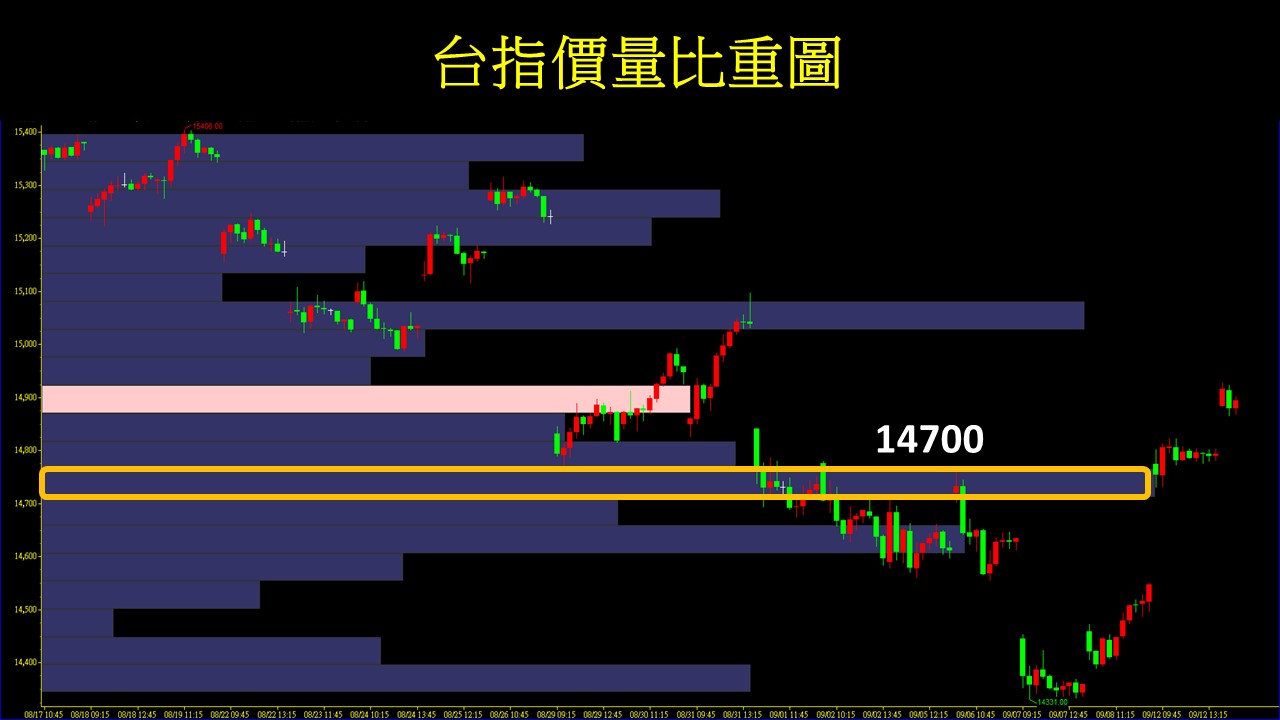 此外,昨天台指開盤大幅跳空而且是強勢開高,不僅躍過了季線壓力,更重要的是站上14700關卡,透過價量比重圖可以發現,9月台指期從8/17開始成為主要的交易月份,近一個月的時間,14700是所有價格中成交量最大的位置,如果今天台指落在14700下方,反彈到這裡通常都有拉回的機會。