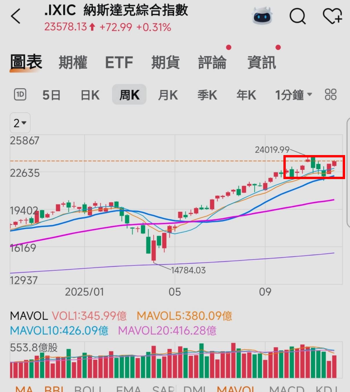 🔶那斯達克指數也持續多頭上漲👉這週是觀察ORCL與光通類股‼️,觀察上半週AI相關零組件股與其它跌深中小反彈力道持續力。