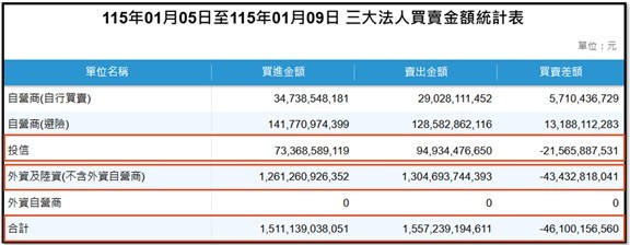 本週法人買賣超:本週三大法人合計賣超台股461億,外資賣超434億,投信賣超215億,自營商(非避險)買超57億、避險買超131億。