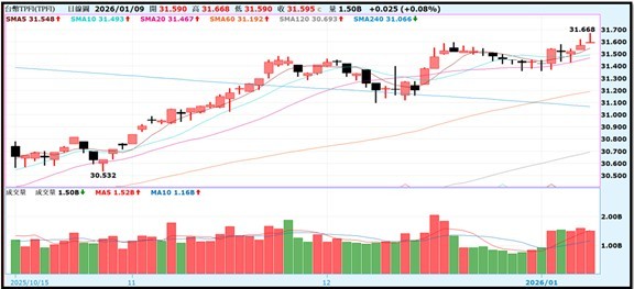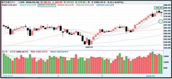 OTC櫃買指數:本週CES展帶動科技類股輪動輪漲,指數突破歷史前高創下新高283.91點,漲多修正難免月線不破仍是多頭格局。OTC本週融資增加34億整體融資目前1234億。