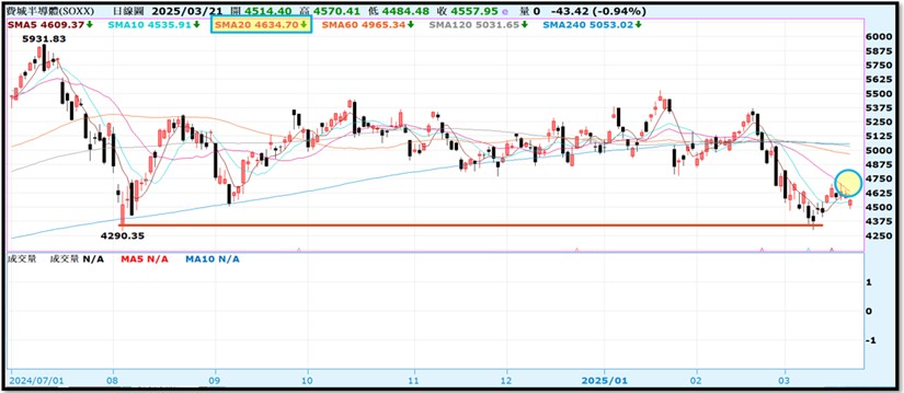 - 費城半導體本週受GTC大會迎來一波反彈但受月線壓力回檔:川普關稅保持彈性之說後,觀察下週能否站回月線