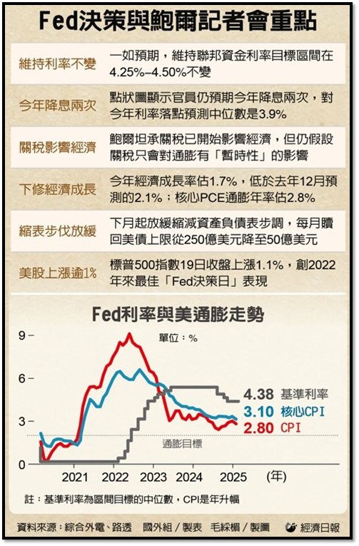 - 鮑爾在記者會上表示,「顯然有一部分,很大一部分」與川普的關稅有關,關稅「往往會拉低經濟成長,並推高通膨」。