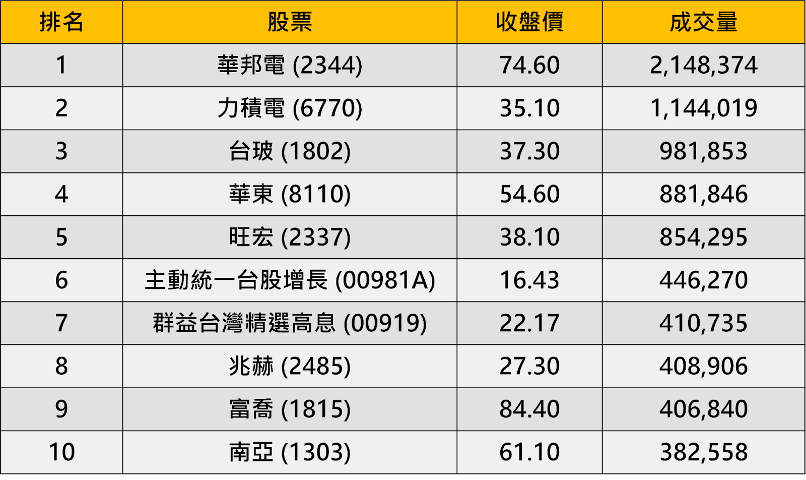 台股上週成交量排行榜