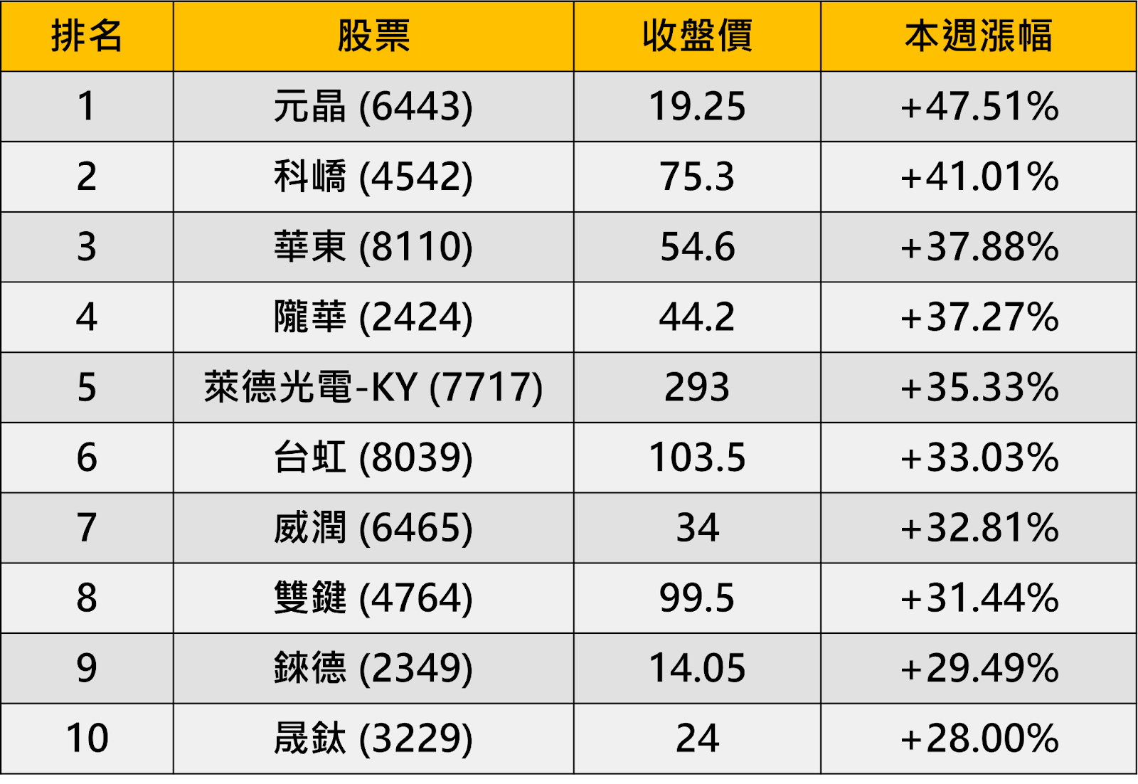 台股上週漲幅排行榜