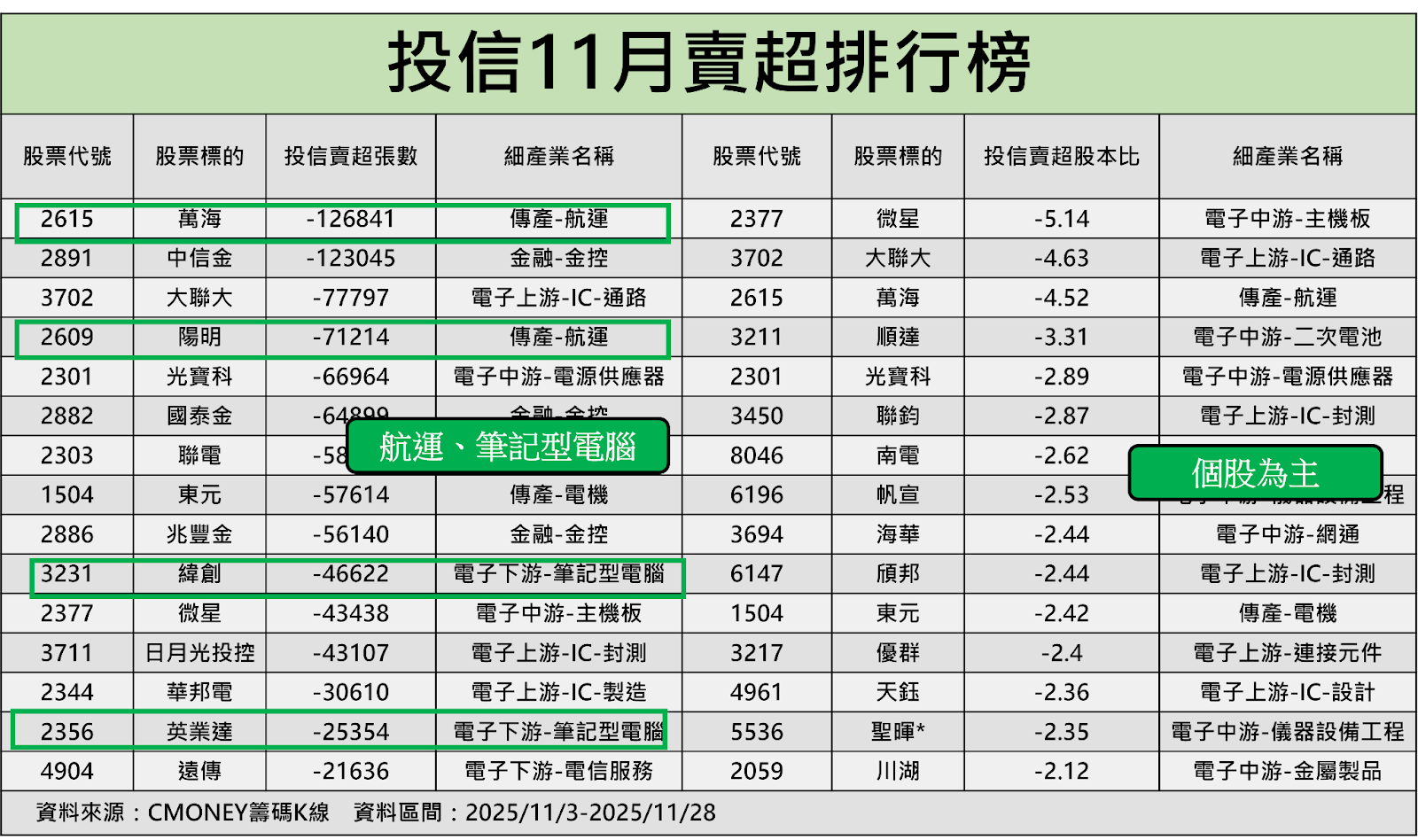 11 月投信整體 大幅買超 120 億,延續內資年底作帳+提前布局明年題材的操作邏輯。