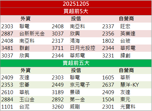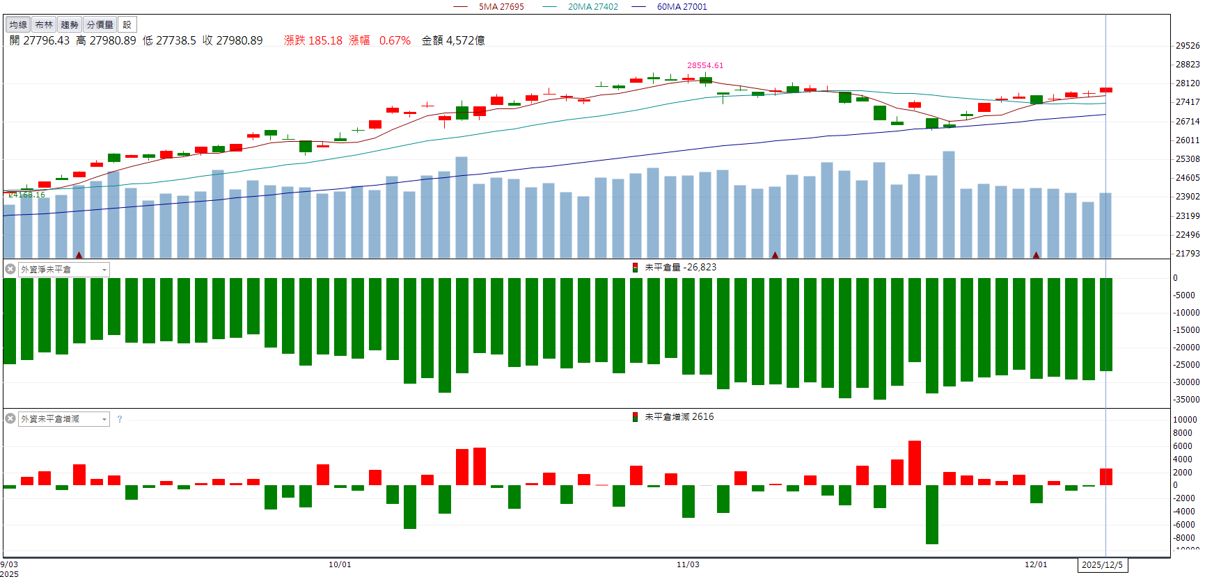 美國聯準會即將公布降息動向,市場氣氛偏觀望,上週五(5)日台股走勢震盪,盤面雖一度翻黑,但AI、矽光子、機器人等族群輪動強勢,尾盤台積電點火,支撐指數續站高檔;終場上漲185.18點(+0.67%)至27980.89點,仍守住五日線,成交金額為4,448億元。法人籌碼方面,外資買超368.8億;自營商買超56.5億;投信賣超4.9億;三大法人合計買超420.3億元。櫃買指數則上漲0.3%至260.65點。