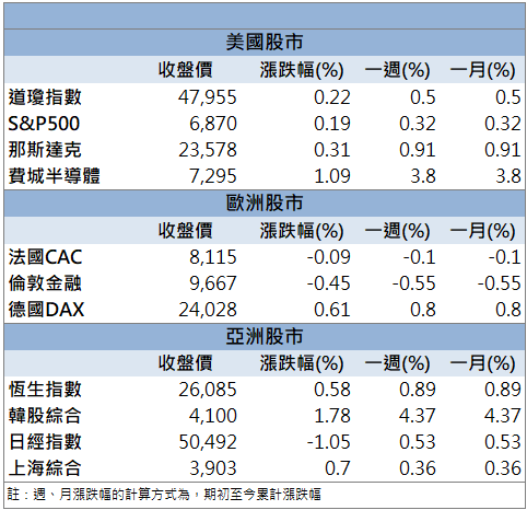 鴻海11月營收成長26%,反映AI研發需求帶動輝達(NVDA)伺服器訂單維持強勢。消息推升科技股氣氛,美股期貨在亞洲與歐洲時段偏強,但投資人關注PCE公布,使開盤前漲幅迅速收斂。美國9月核心PCE月增0.2%,與前月一致;年增降至2.8%。通膨維持黏性但未惡化,市場對聯準會12月降息的預期進一步上升。12月密大消費者信心指數回升至53.3,優於預期,使恐慌指數VIX下滑並帶動美股一度走高。不過,FOMC會議將於即將登場,方向性部位偏少,使指數高檔震盪。收盤時主要指數仍全數上漲。