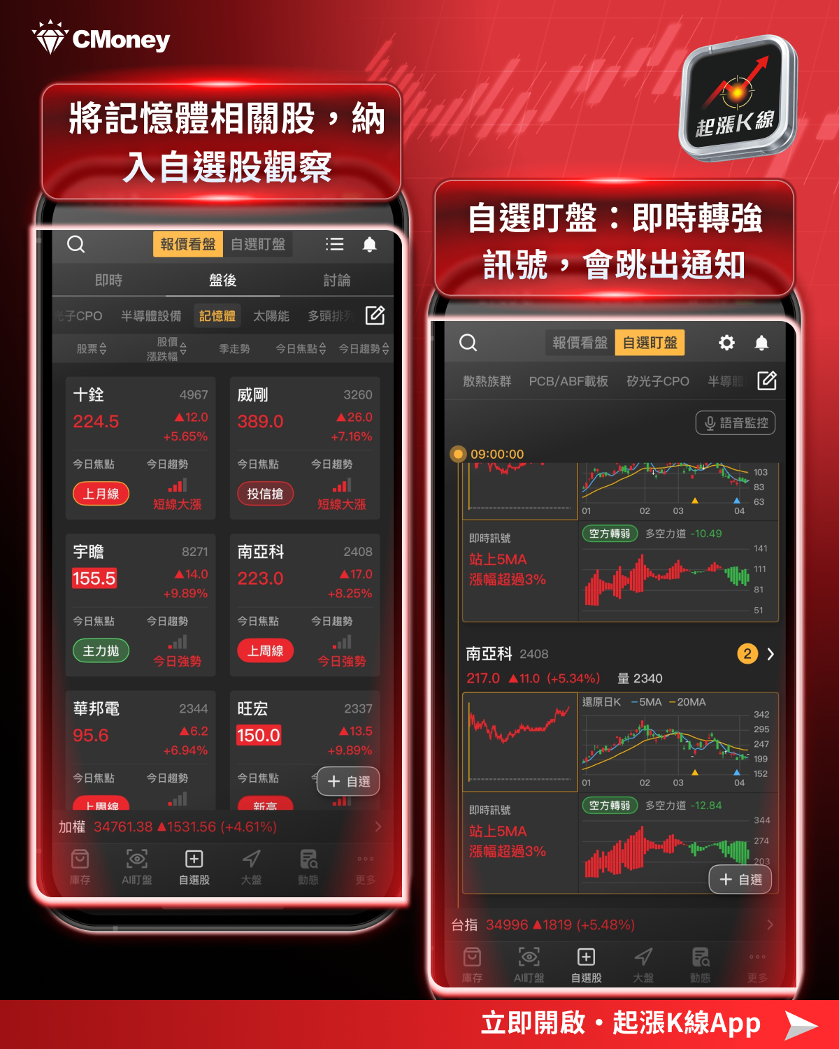 對投資人而言,此刻的回調或許正是布局的機會窗口,而非恐慌出場的理由。建議以南亞科、威剛、宜鼎為核心,分批布局、控制倉位,並善用《起漲K線》的自選股與起漲偵測功能,在技術面確認訊號出現的第一時間卡位。在這波記憶體大航海時代中,不缺席、不追高,才是最有效率的參與方式。