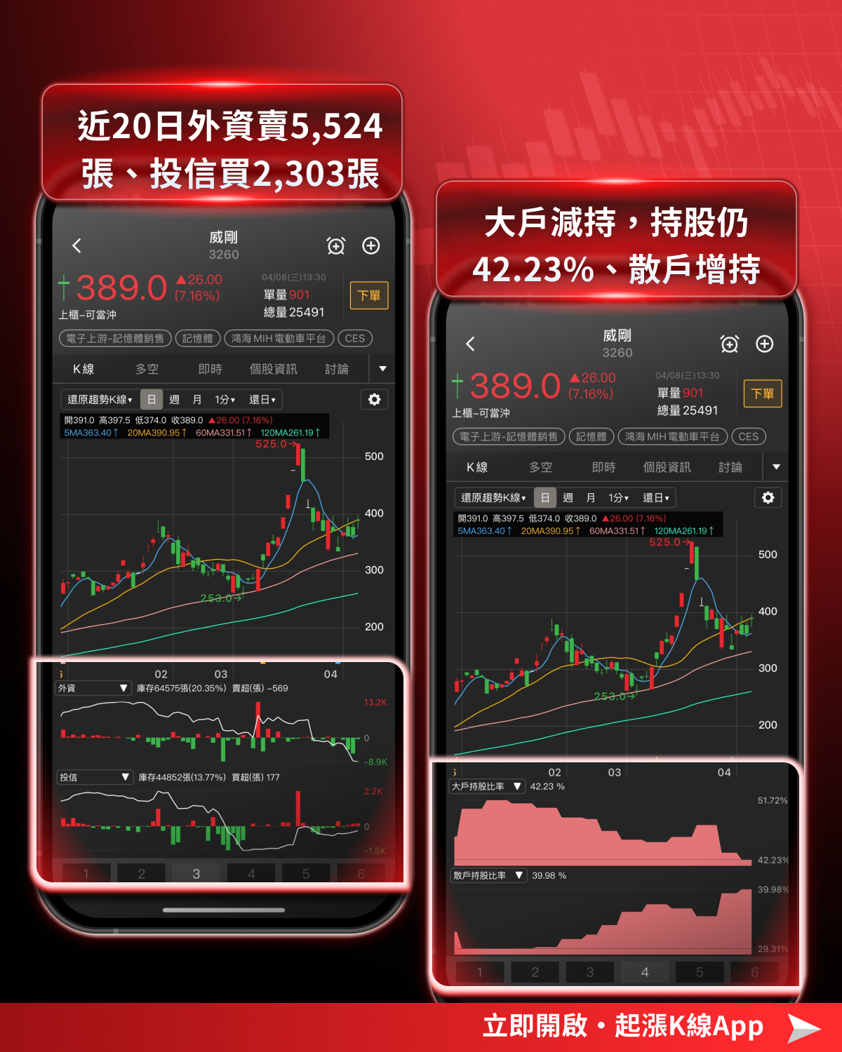打開《起漲K線》,「外資、投信」:內外資不同步,外資大舉拋售、投信接棒進場。近 20 日外資賣超 5,524 張,投信買超 2,303 張。(外資持股 20.53%、投信持股 13.77%)「大戶、散戶」:大戶/散戶持股動向。威剛(3260)大戶持股比率略為下滑,但整體仍維持在 42.23% 的水位,顯示籌碼仍偏向集中,後續可持續觀察大戶動向是否再度回流。