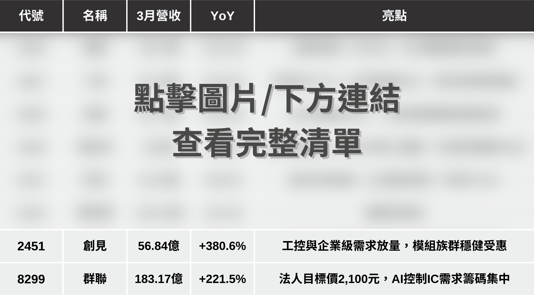 記憶體族群3月份整體繳出高水準成績單:三大模組廠威剛、十銓、宜鼎各以181%、120%、484%的年增幅寫下歷史新高,DRAM原廠南亞科更以 560%的驚人年增率刷新市場認知,旺宏也首度單季破百億。族群整體呈現量價齊揚格局,且二季展望同樣樂觀,DRAM與NAND合約價預計再調漲30%至40%以上,業績高峰尚未到頂,後市仍有續航空間。