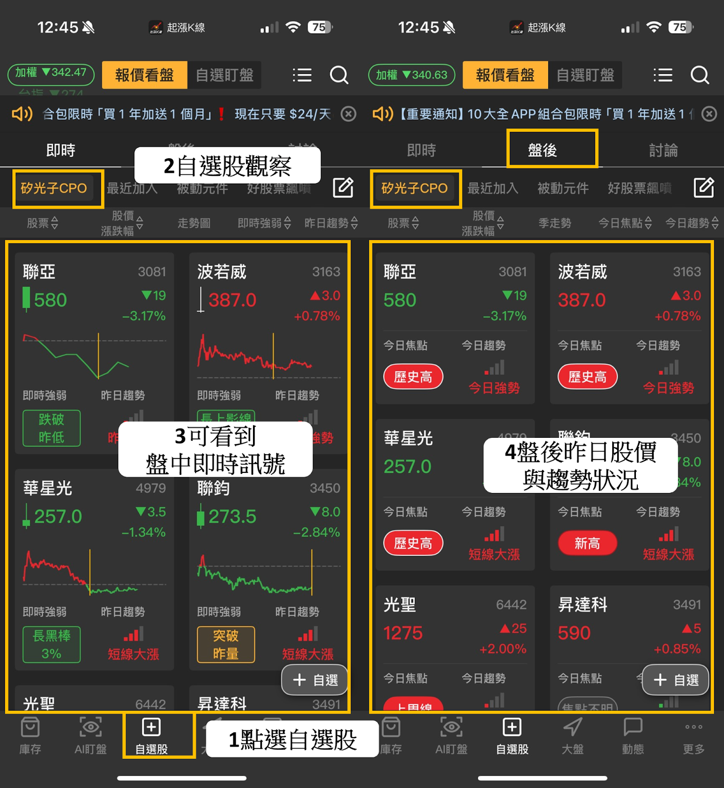 【自選清單功能】:每天還在花費大把時間看盤?《起漲K線》的自選股與庫存股功能,可以將向中或持有的標的彙整成清單,只要花費短短幾秒鐘,就可以輕鬆一覽所有股票的當日動向,輕鬆找出即將北上的強勢標的。