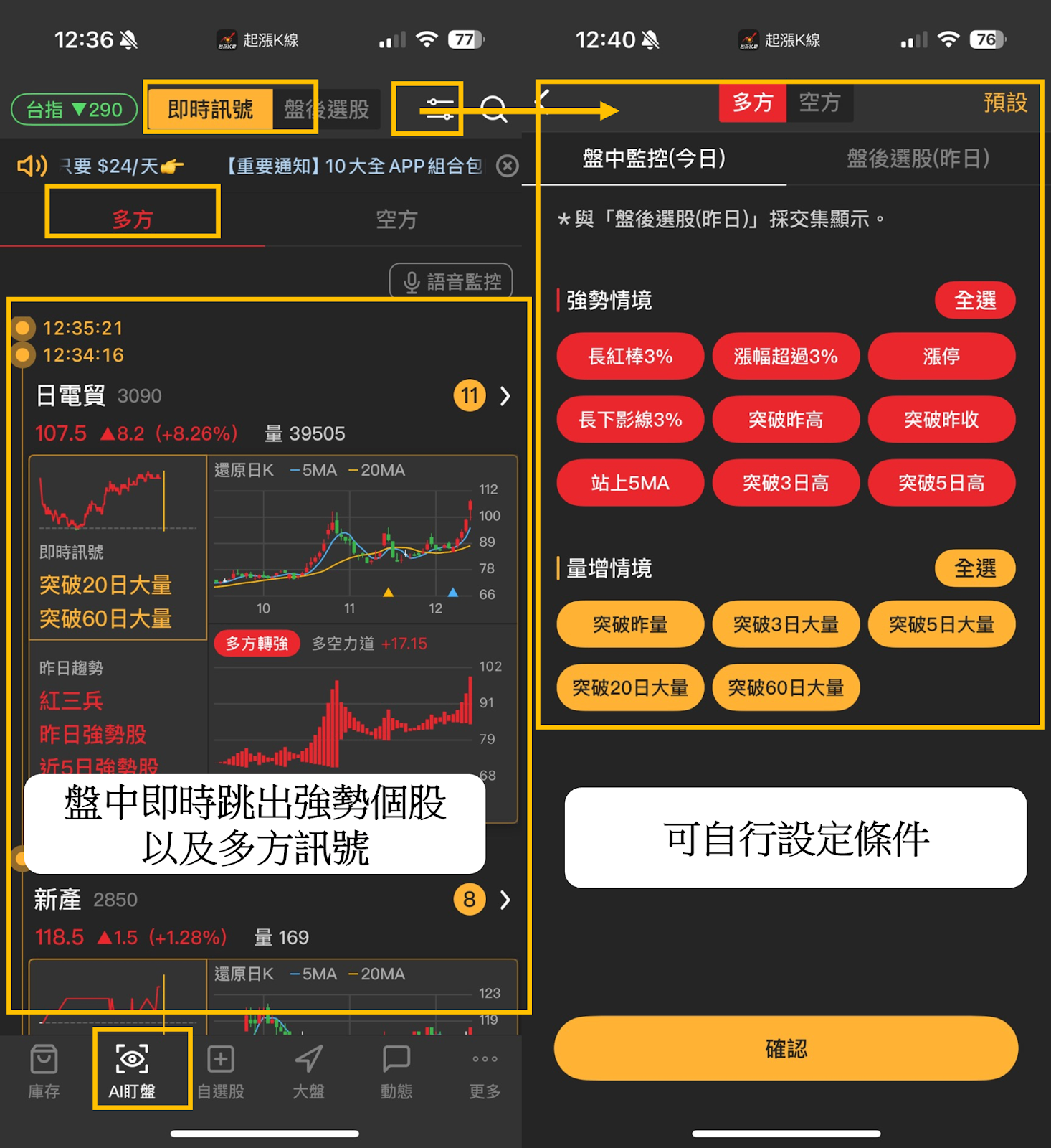 【AI盯盤功能】:投資人可以不用一直關注股市,《起漲K線》也能迅速的讓你找到符合起漲訊號的個股,依照不同情境,例如:爆大量、達成型態、股價突破均線、漲幅超過3%、漲停等…,觀察這些即時訊號,找到最佳進場點!