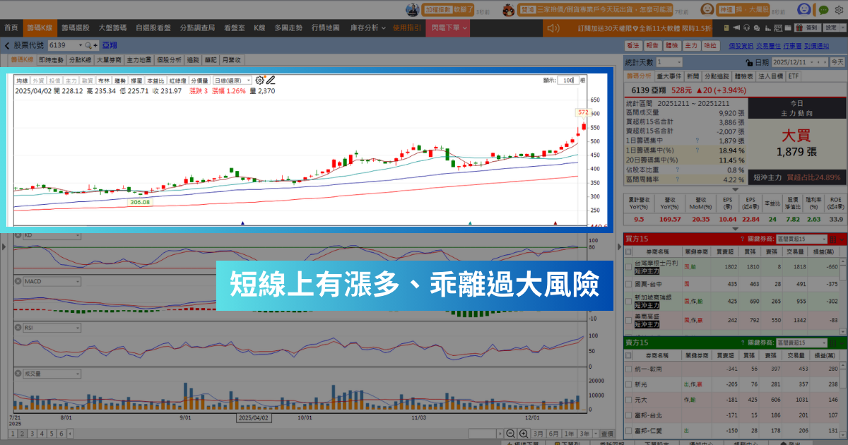 最後看到亞翔的籌碼動向,來判斷是不是有機會再創新天價。首先看到三大法人中的外資,在撰稿時呈現連續五日買進,同時有越買約多的跡象,總張數超過9,000張,不過投信則較為保守,短線上買賣動向較少。主力指標則是在外資的帶動下,同樣呈現連五買,短線籌碼集中度飆升,可以說是推升股價的關鍵之一。整體來看,亞翔的背後籌碼狀況良好,有機會持續上攻,不過仍需要注意短線上回調的風險。