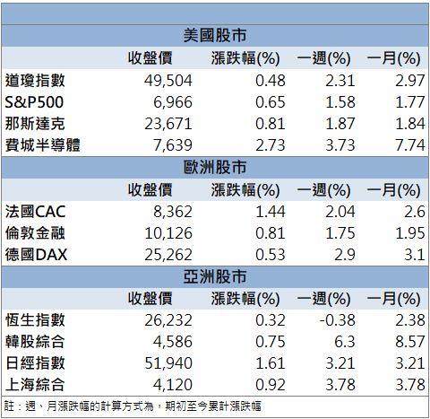 12 月非農僅新增約 5 萬人、遠低於預期,但失業率意外降至 4.4%,配合薪資成長控制在溫和區間,使市場下修 1 月降息機率,卻未打擊風險偏好。歐股 STOXX600 收漲約 1%、日經 225 續處高檔,全球股市同步偏多。
