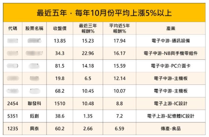 從「最近五年,每年10月平均上漲5%以上」的清單來看,有幾個重點訊號: