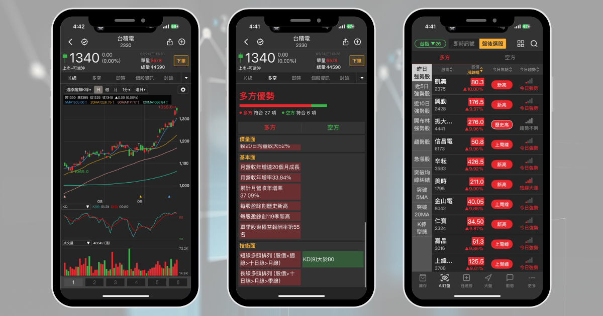 想要查詢剛剛上述所提及的「成交量」、「價格走勢」或是「KD快慢線」等等的指標,可以利用《起漲K線》的個股解析功能,輕鬆查詢標的的狀態。除此之外,在個股的多空功能也會直接幫你彙整標的背後技術面的潛在利多或利空,假設投資人沒有像中的標的,也可以從「AI選股」功能中,找到相對指標強勢的股票,輕鬆買在上攻前的起漲點,其他還有更多功能等著你去探索。