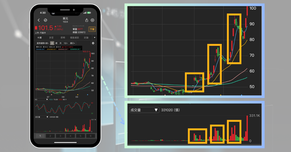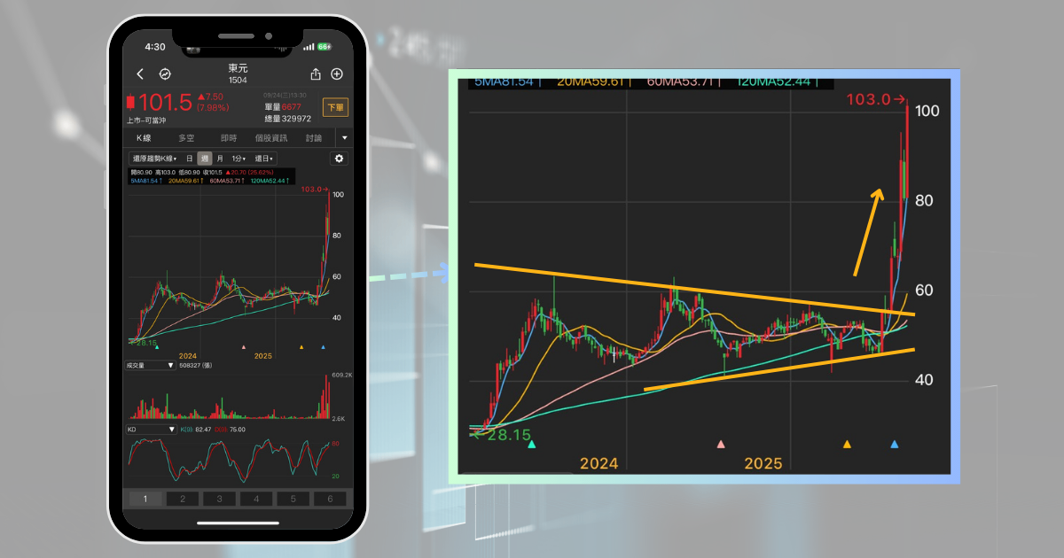打開《起漲K線》的K線頁,可以看到東元在2023年一度攻上60元後,進入長達兩年的盤整區間,同時最高點越來越低,形成一條無形的下降趨勢線,同時進入盤整的收斂區間。直到今年七月,宣布與鴻海攜手合作進軍AI市場,股價成功表態,至撰稿時漲幅更是高達120%,衝上百元新天價。