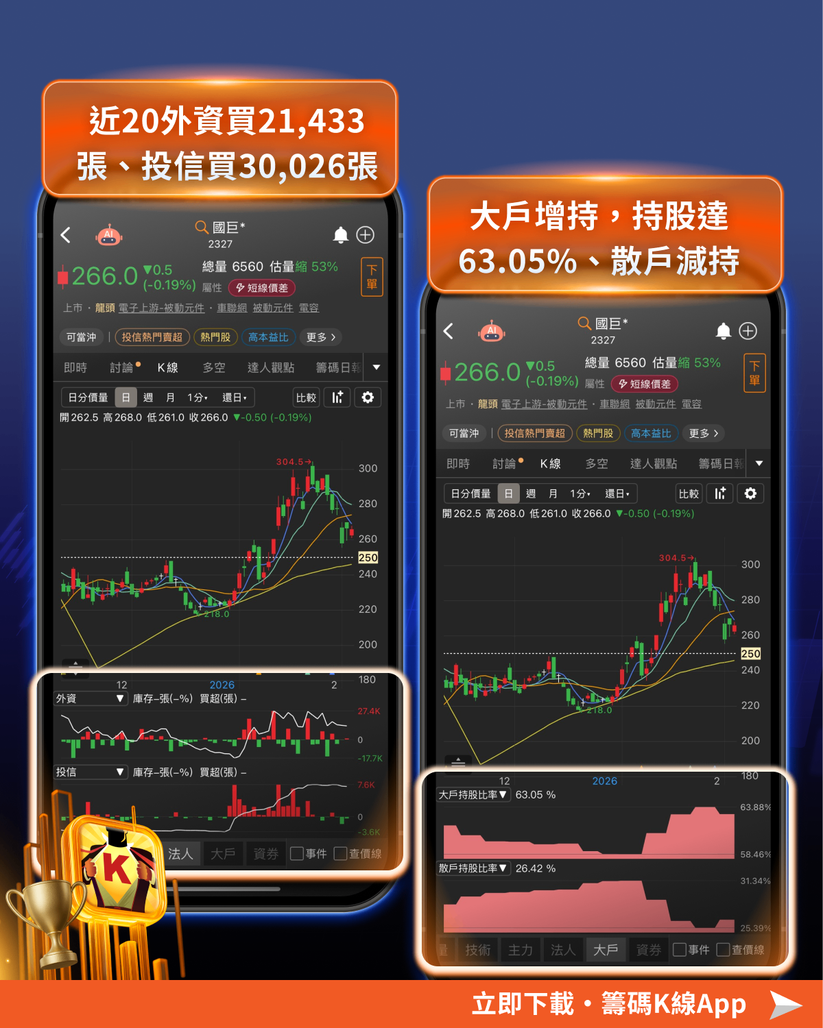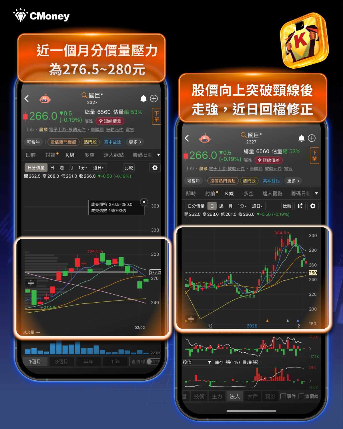 國巨(2327)屬於 「漲價循環核心股」,不是爆發型,在 AI 與車用雙主線下,獲利能見度最高。法人同步買超,不過操作偏向回檔承接、非追價型,近期股價回檔休息,後續觀察法人是否持續買盤進駐,進而再度向上推升股價。