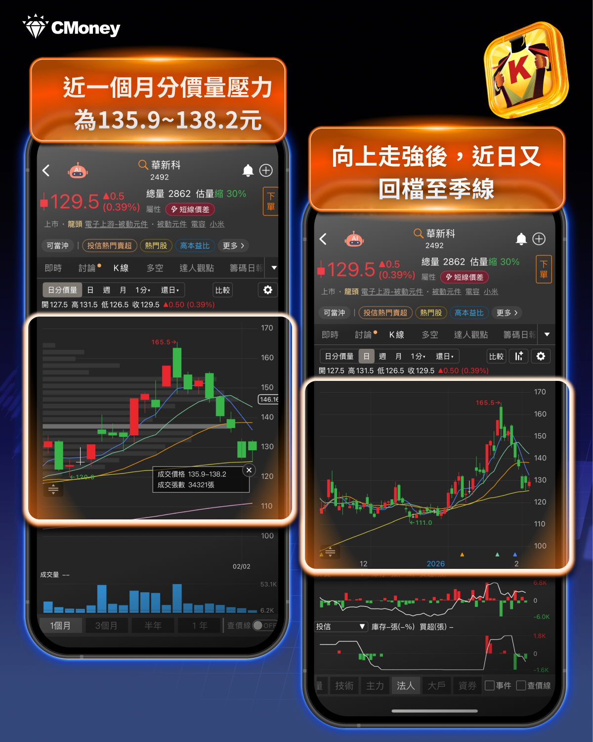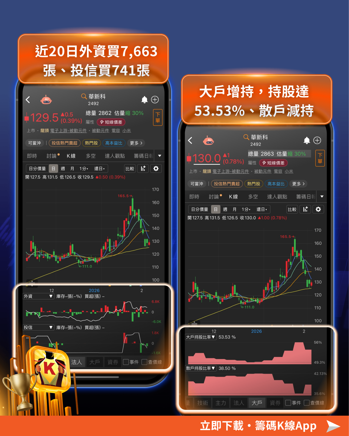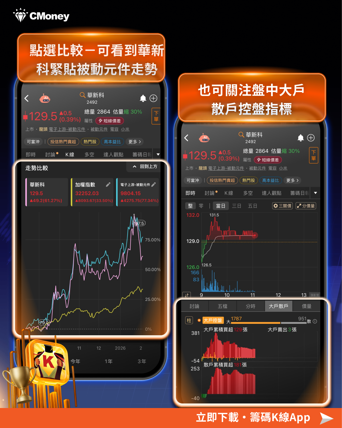 華新科(2492)屬於 「MLCC 漲價彈性股」,當報價與接單能見度進一步確認,股價反應速度通常快於龍頭。法人近期同步買超,大戶也積極進場,籌碼較為健康,後續持續關注。