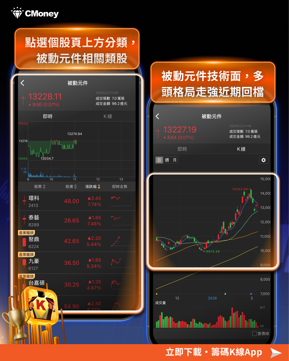 打開《籌碼K線》APP,我們選擇想觀察之個股,點選上方分類-「被動元件」,即可看到被動元件相關個股,以及技術面走勢。被動元件多頭格局走強,近期回檔休息。