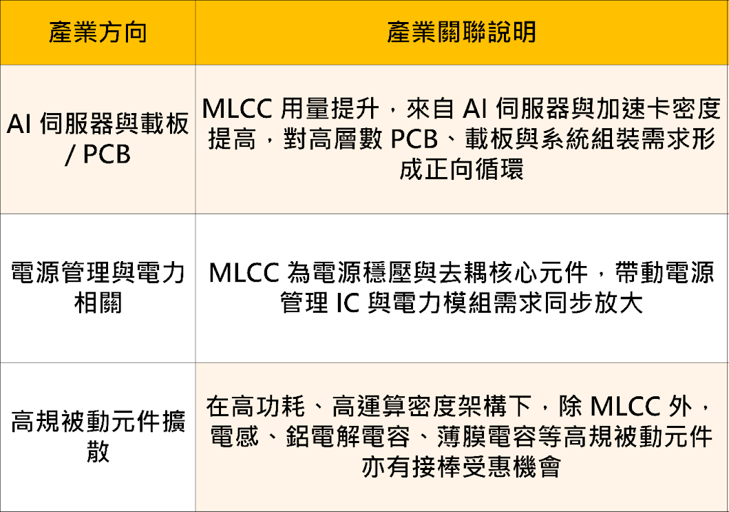 MLCC 用量提升來自伺服器與加速卡密度提升,對上游板材與系統需求形成正向循環。