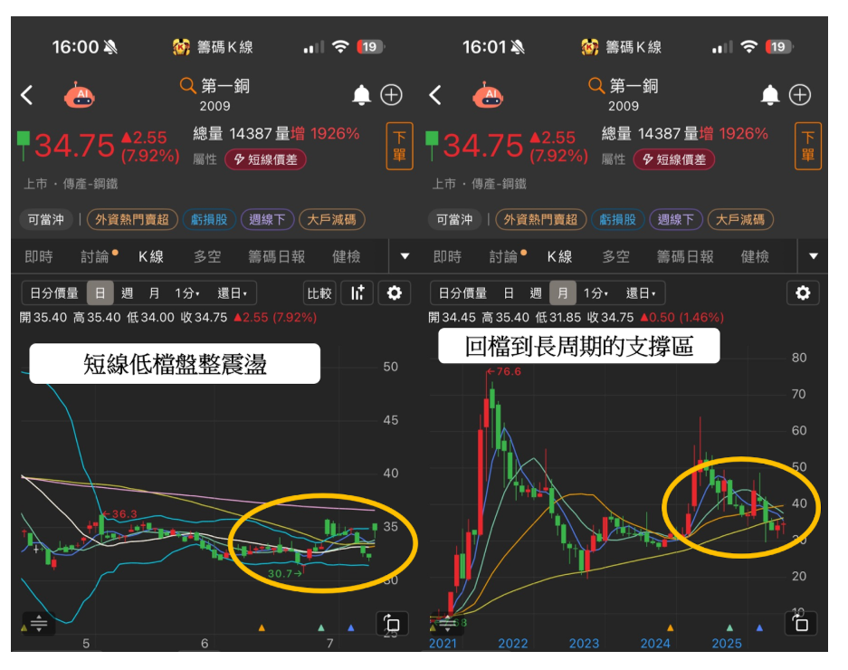 再看到長周期的月K線,第一銅(2009)自從2021年整體偏向於中立偏多,從技術面可以看到,股價只要回檔到黃線(季線)股價就會出現反彈,代表著黃線有可能是第一銅(2009)的支撐區。因此近期又回到黃線(季線)附近,是否有機會股價再度出現反彈,持續觀察下去。