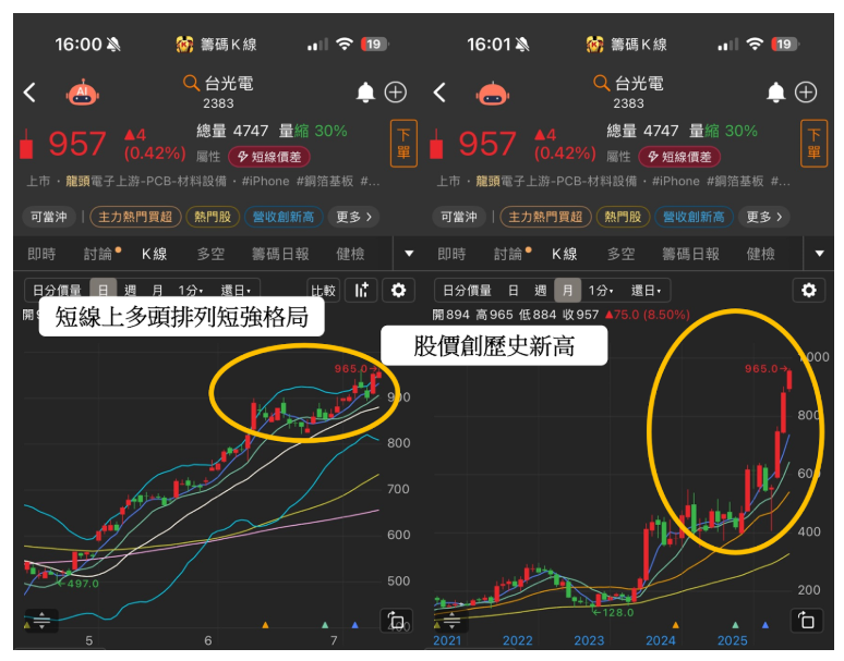 這樣的技術線型顯示出:股價短多長多的現象。上方現在沒有任何壓力,就看這波行情能帶台光電(2383)到哪個地方了。多頭行情檔不住。
