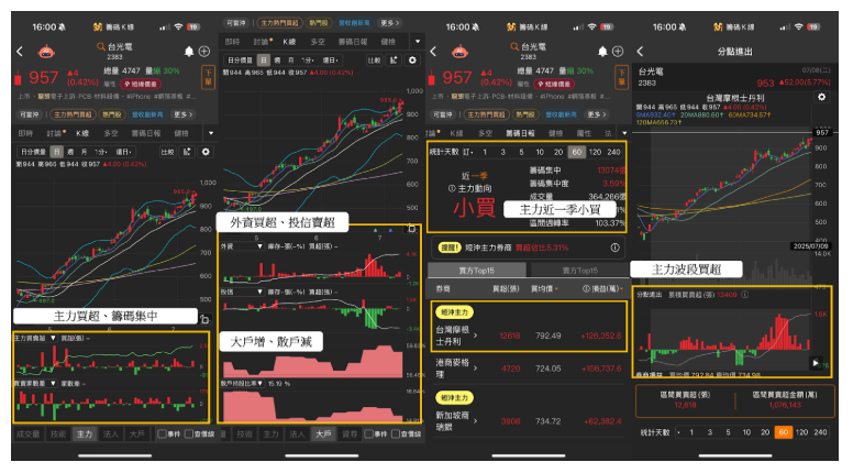 這些多項籌碼指標,都顯示出台光電(2383)目前受到主力、外資、大戶的青睞,皆站在買方居多,整體短線上股價仍都續創新高,偏多思考。後續觀察投信是否回頭來買,並且更多主力進場,近而持續的向上推升股價。