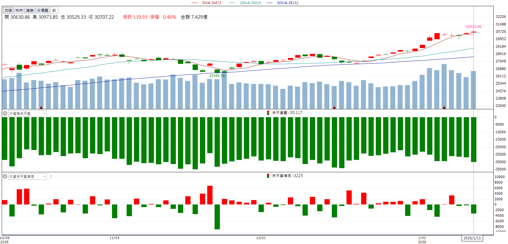昨(13)日台股在國安基金退場後未見信心動搖,加上美台關稅消息激勵,加權指數早盤一度大漲逾400點,最高觸及30,973.85點再創盤中新高,隨後獲利了結賣壓出籠;終場上漲139.93點(+0.46%)至30707.22點,改寫收盤新高,成交金額為7,234億元。法人籌碼方面,外資買超157.4億;自營商買超38.7億;投信賣超68.3億;三大法人合計買超127.8億元。櫃買指數則下跌0.42%至285.36點。