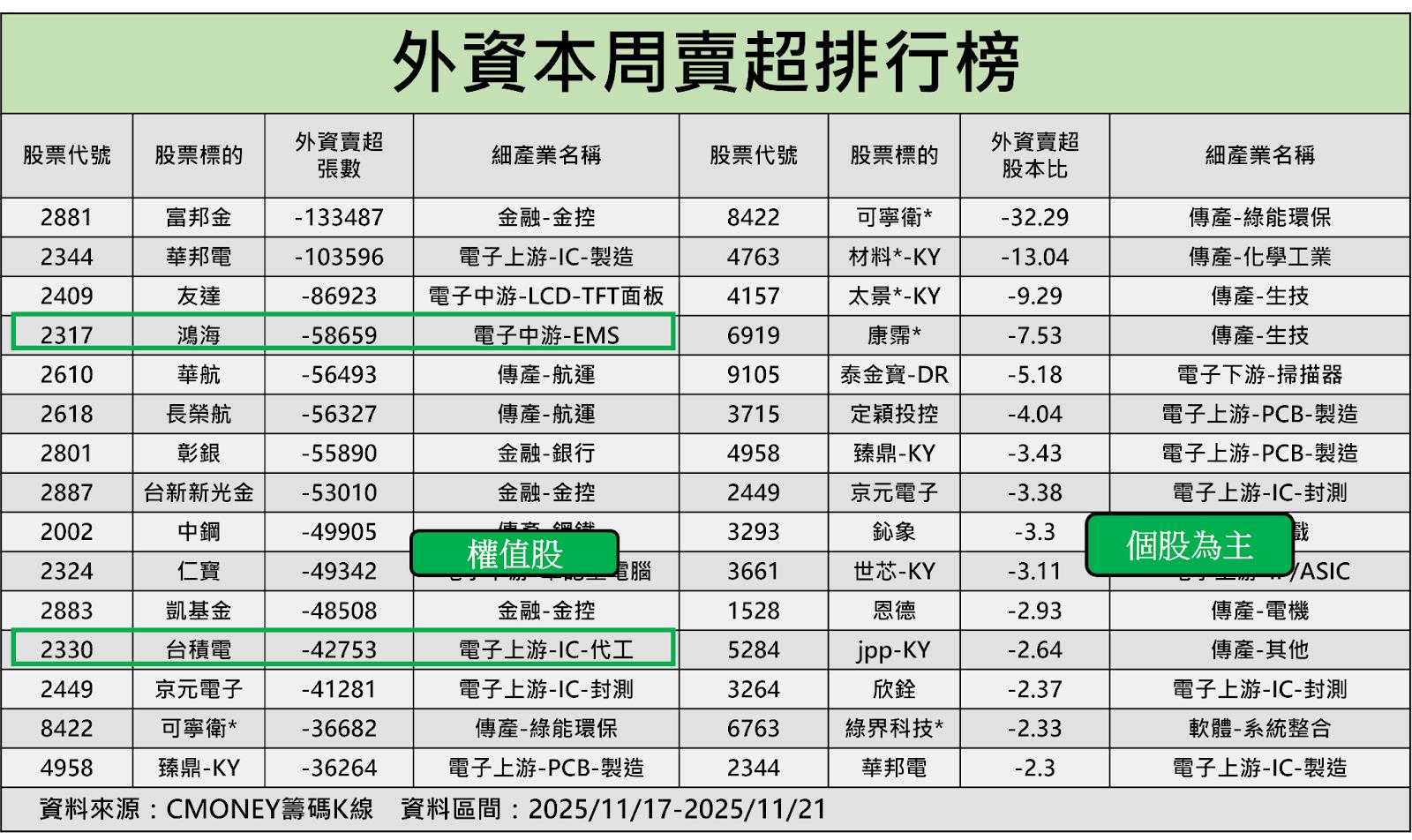 台股上週急速下跌,單週跌逾962點,創下季線被擊破及大量成交的壓力,外資大賣壓力明顯,是近期市場的最大焦點。全球資金回撤,尤其11月中旬AI族群獲利了結導致外資加速流出,使得台股壓力山大。短線籌碼呈現淨期貨空單及重度賣超,外資調節大型權值股與ETF,且轉向防禦性或現金部位。此波多空交戰激烈,投資人必須辨識資金動向,抓住主力布局與輪動機會,迎戰盤勢震盪!