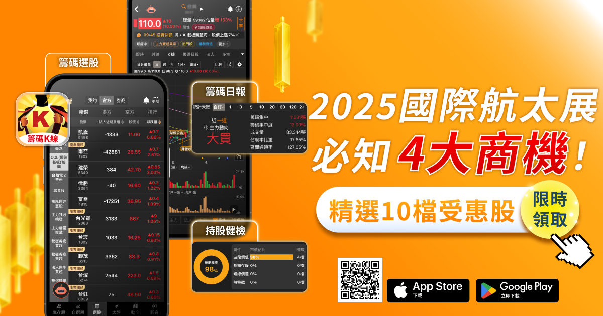 2025年台北國際航太暨國防工業展,不僅是國際防務科技的展示舞台,更是台灣與全球產業鏈深度連結的重要節點。隨著國防預算擴大、太空產業崛起,加上無人載具與AI防務應用加速落地,相關概念股正吸引主力大舉進場。投資人可透過《籌碼K線》追蹤大戶動向,把握這波航太國防浪潮中的潛力標的。