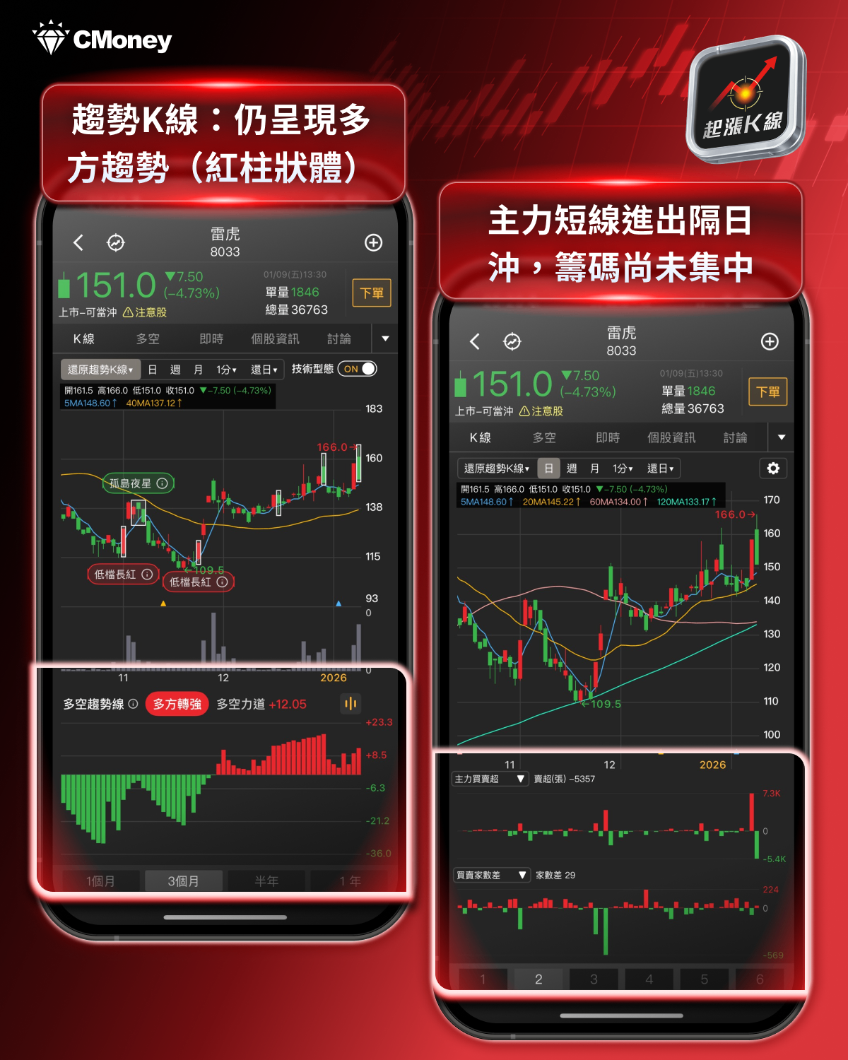 趨勢K線:多空趨勢變化,雷虎(8033)成呈現多方趨勢(紅柱狀體)