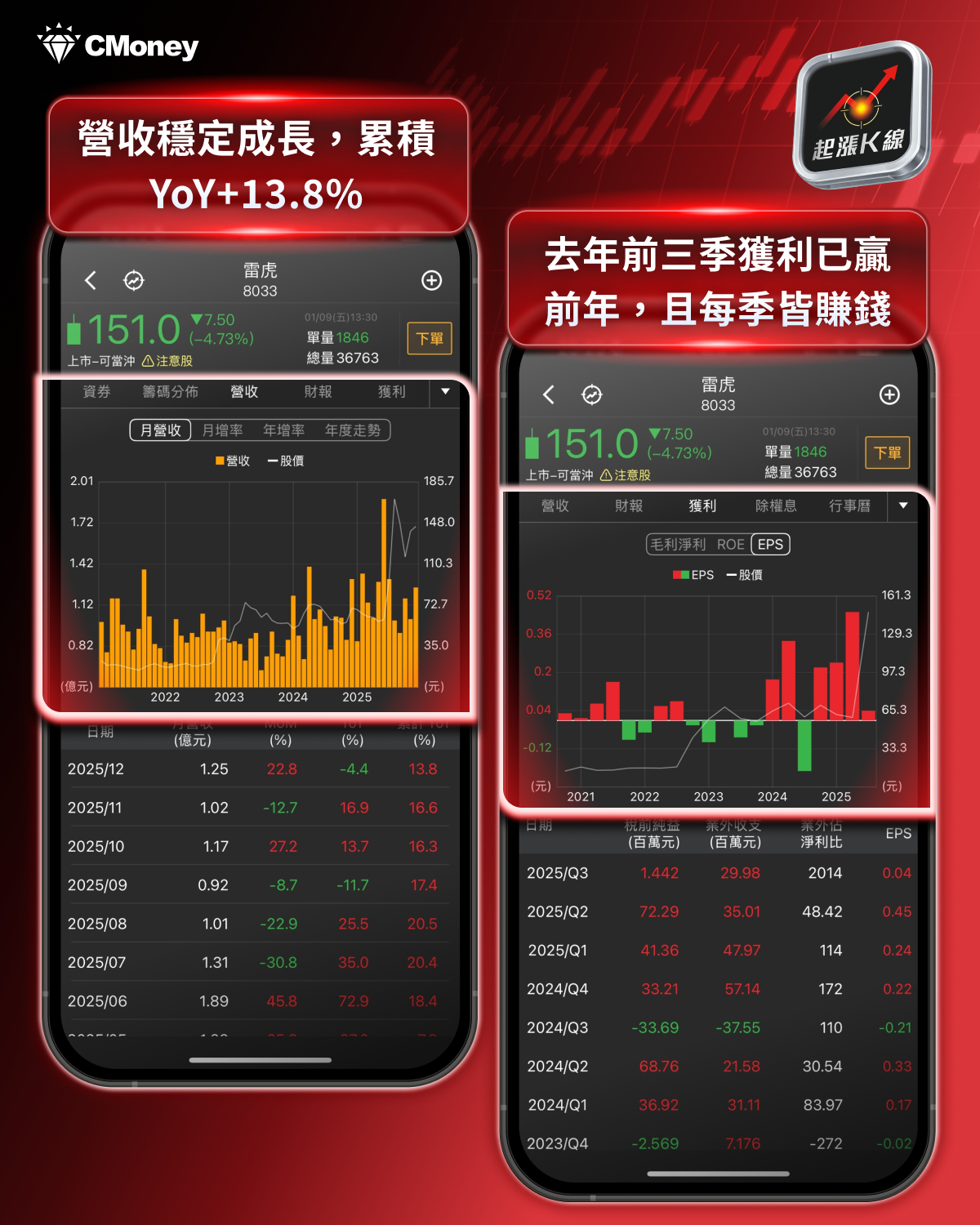 若我們想看到整體實際營收與獲利狀況,可以打開起漲K線APP,點選上方「營收、獲利」,即可看到每月/每季的營運狀況。從圖我們可以得知,雷虎(8033)整體營收仍呈現成長階段,12月營收為 1.25億元,MoM小增22.8%、YoY小減4.4%,累積YoY+13.8%。再看到獲利表現,可以看到2025前三季獲利已贏前年,且去年前三季每季皆賺錢。