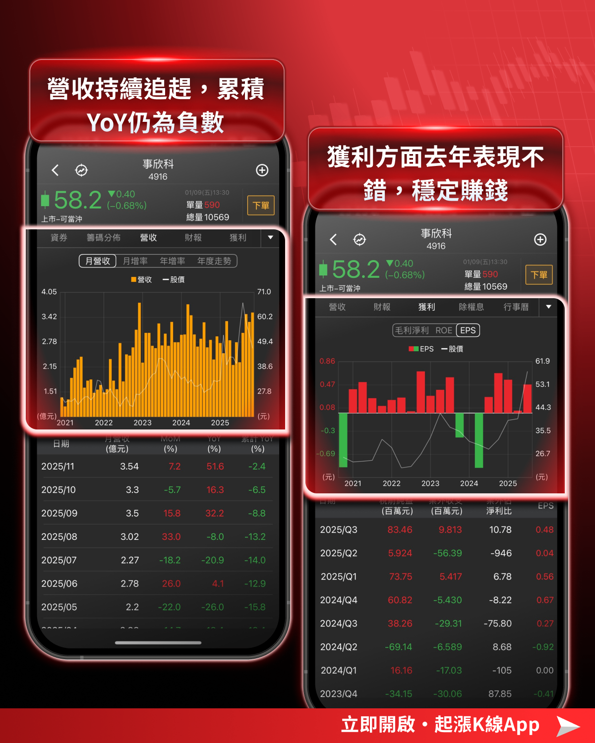 打開《起漲K線》,確認「營收、獲利」狀況。