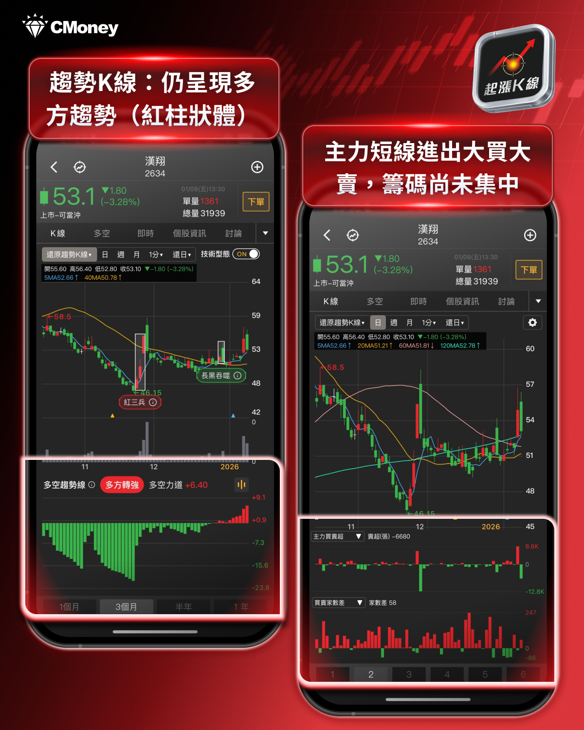 趨勢K線:多空趨勢變化,漢翔(2634)成呈現多方趨勢(紅柱狀體)