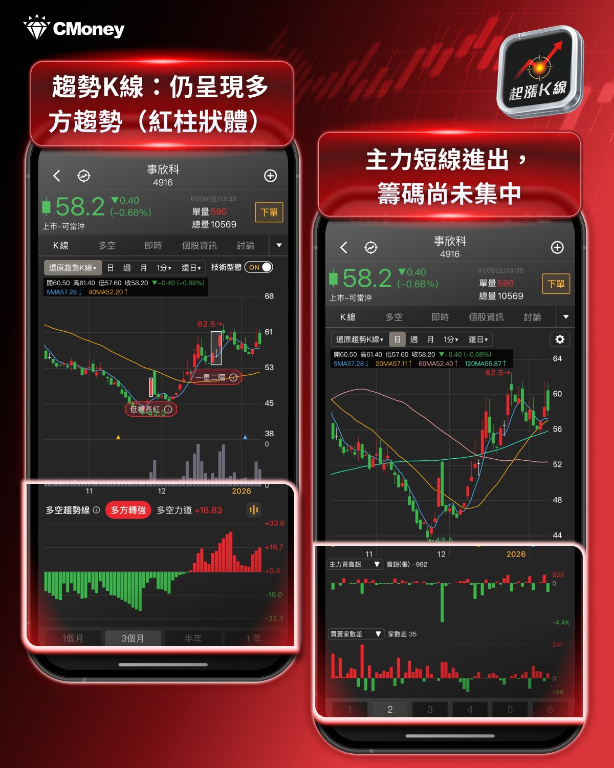 趨勢K線:多空趨勢變化,事欣科(4916)成呈現多方趨勢(紅柱狀體)