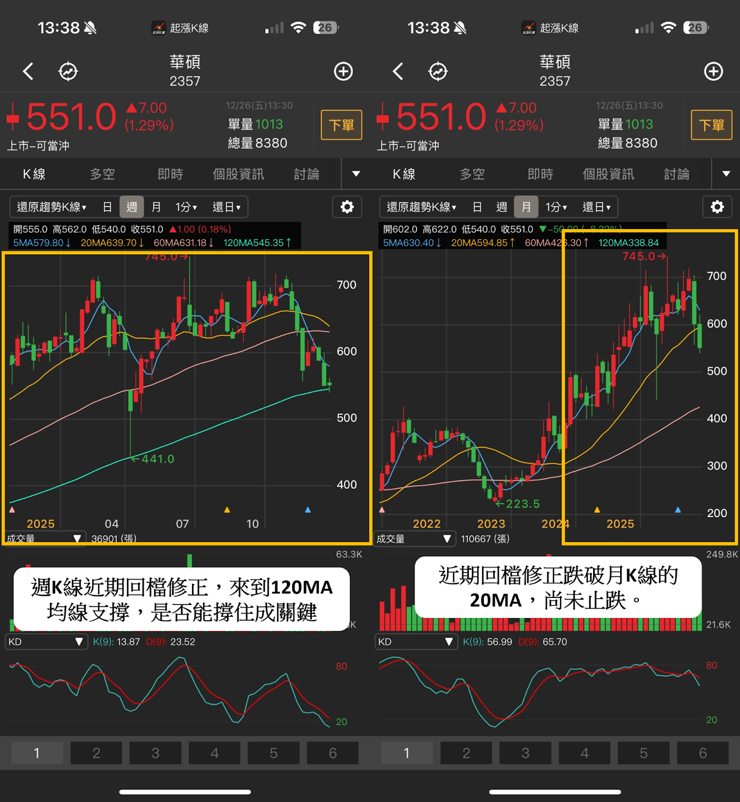 週K線:華碩(2357)近期回檔修正,來到120MA均線支撐,是否能撐住。