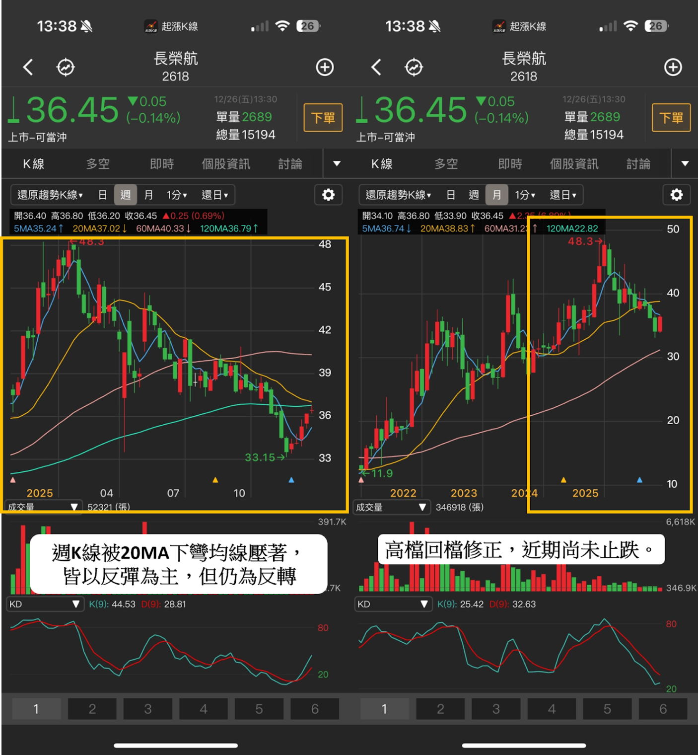 週K線:長榮航(2618)被下彎的20MA的均線下壓,至今尚未站上,近期為反彈為主,而非轉多。