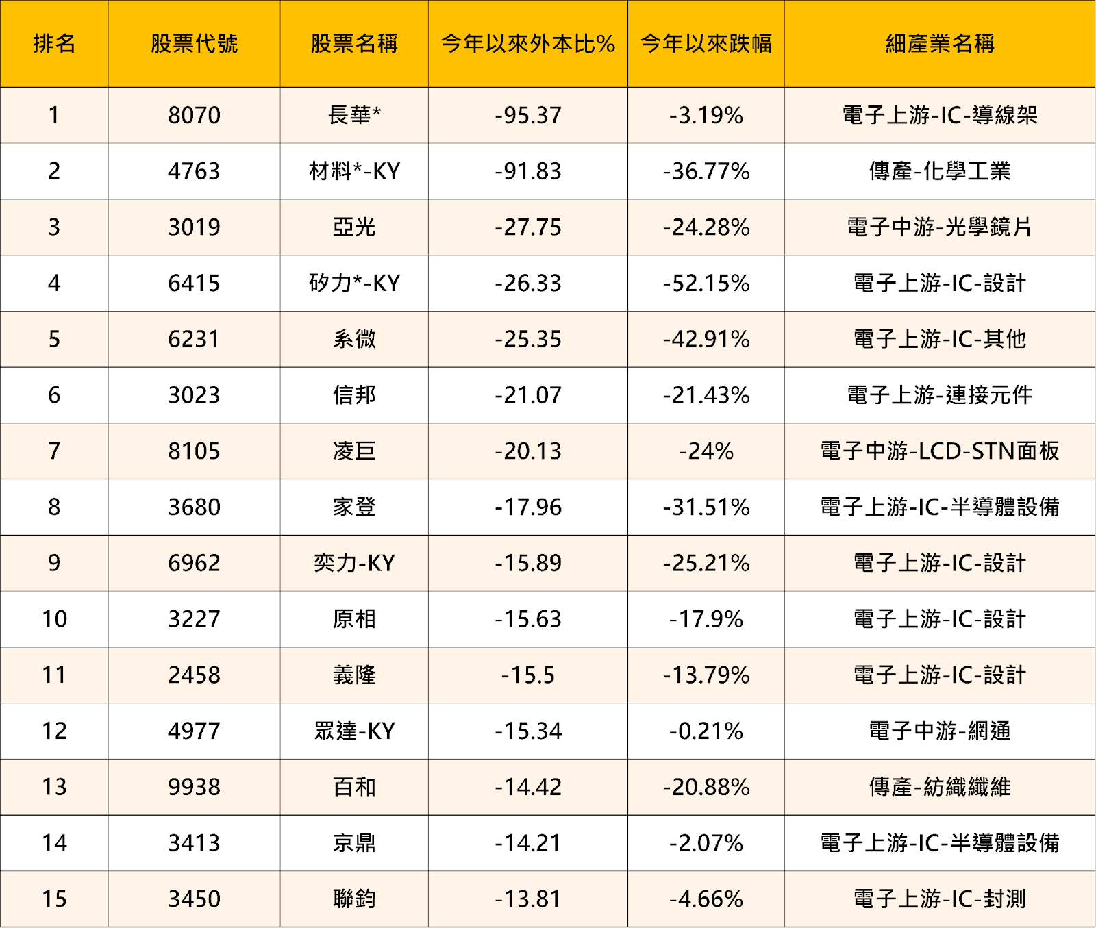 從名單可見,多數個股跌幅未必最大,卻普遍出現: