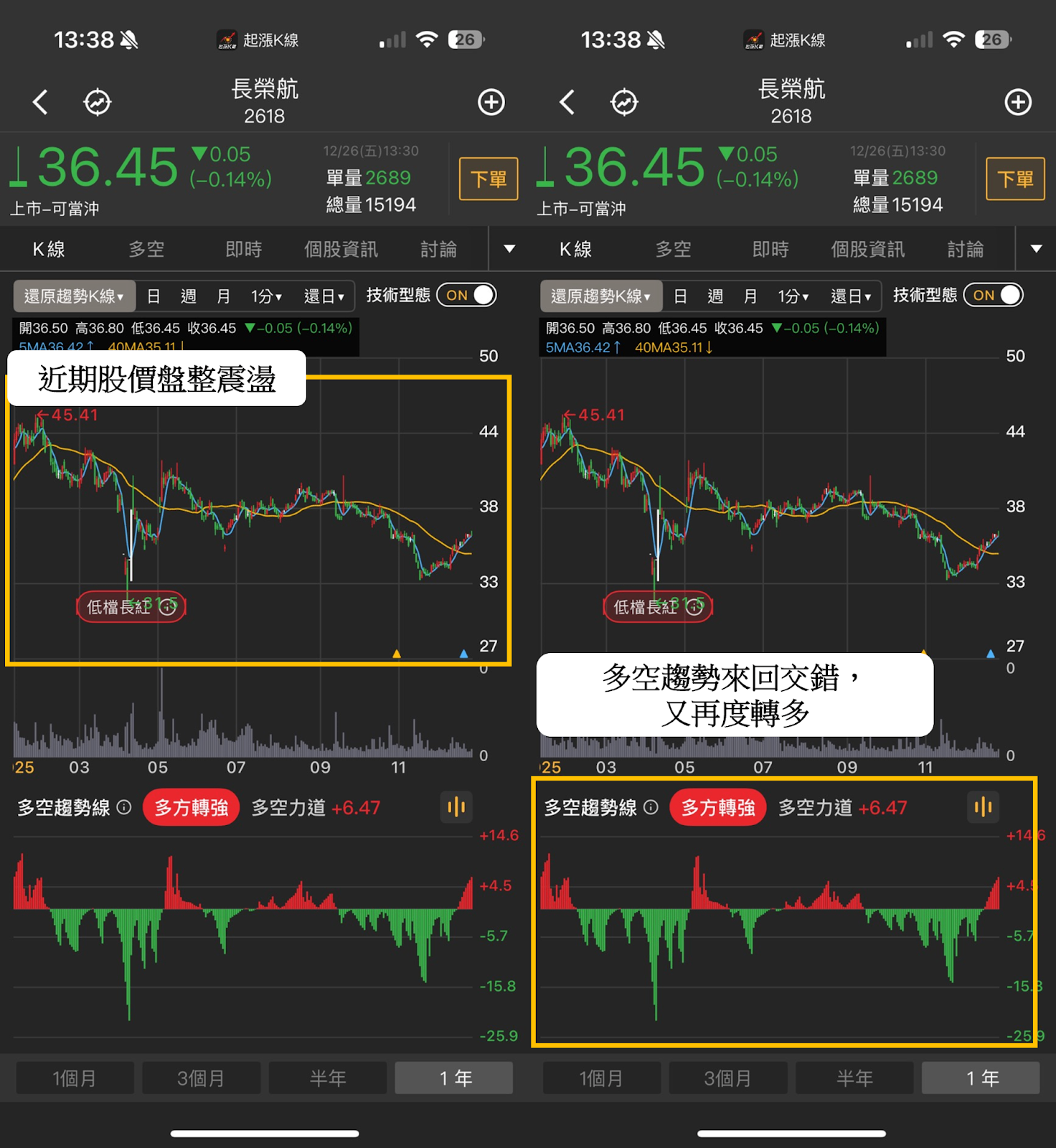 首先,我們打開籌碼K線APP,輸入想觀察的個股代號,就可看到個股的技術與籌碼。舉例我們今天輸入長榮航(2618),下一步點選「K線」,就可以看到長榮航(2618)整體的技術線型,以及下方有多個籌碼指標可以跟著對應觀察。