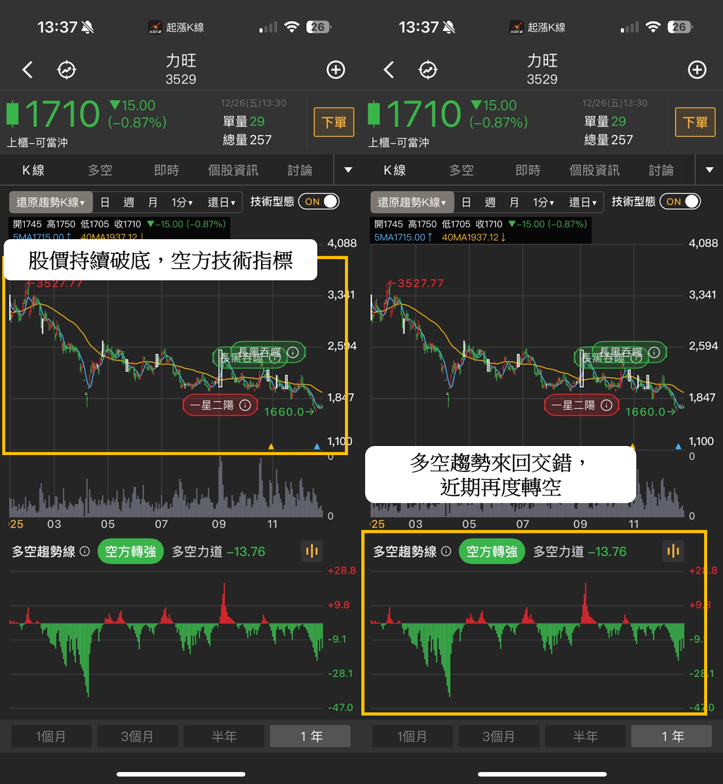 趨勢K線:可以發現多空趨勢來回交錯,近期再度轉空。股價再度破底