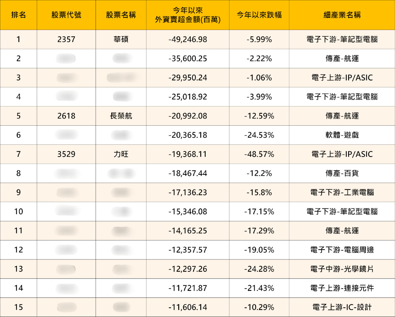 外資「賣超占股本比」TOP15