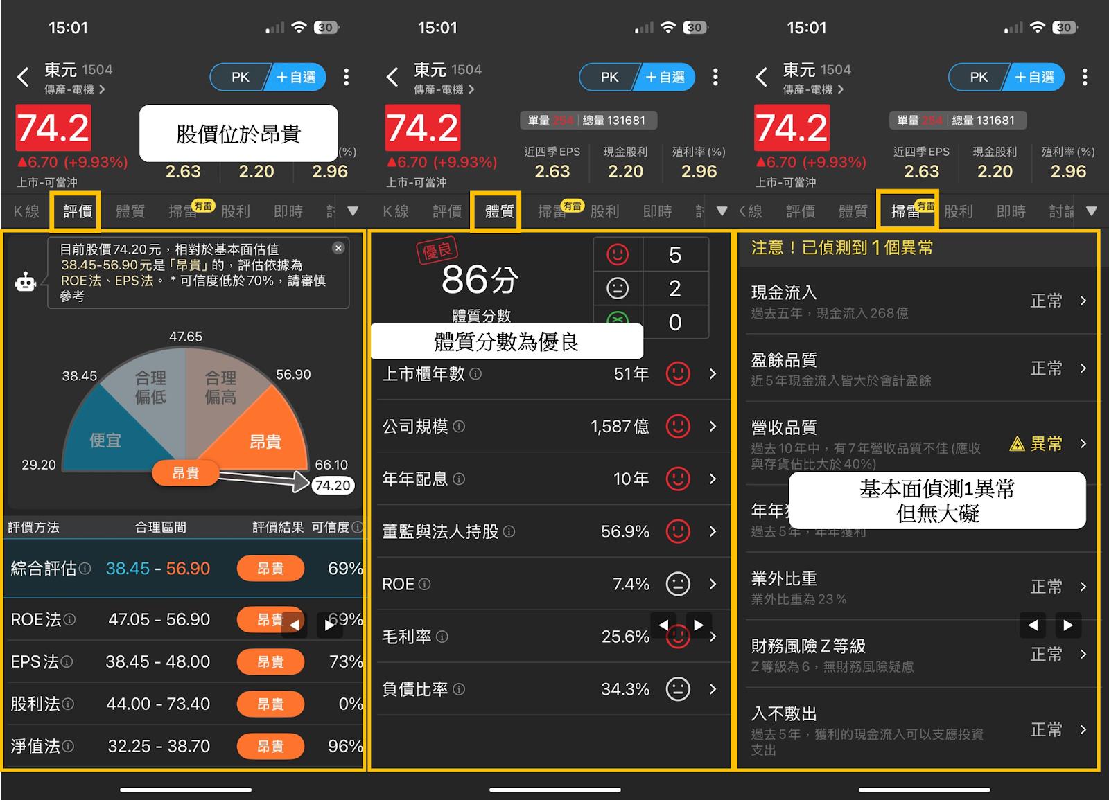 (1)點選「評價」判斷目前股價位在便宜還是昂貴-股價目前落在昂貴,代表著東元(1504)短線上已經漲多,恐會有追高風險。