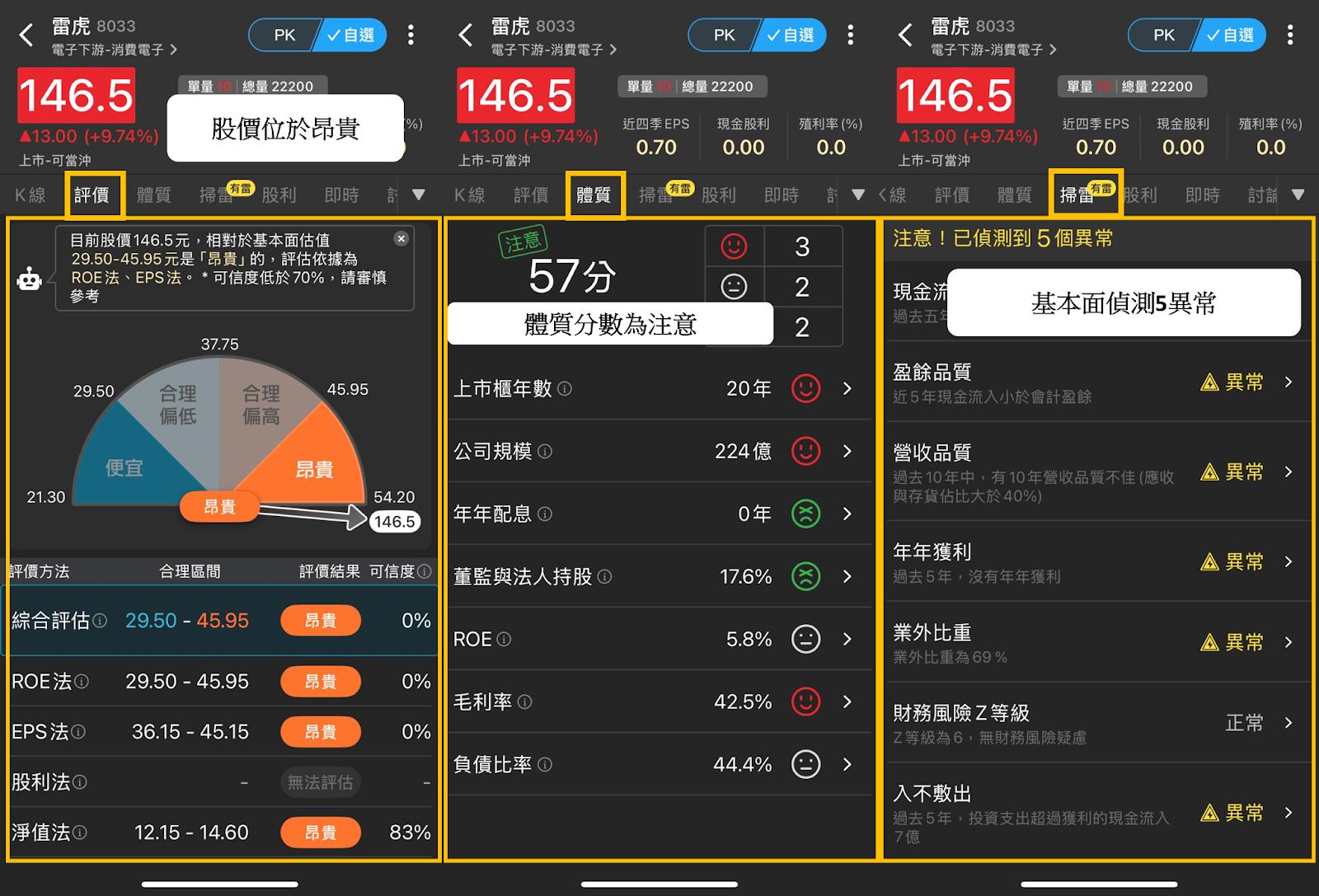 (1)點選「評價」判斷目前股價位在便宜還是昂貴-股價目前落在昂貴,代表著雷虎(8033)短線上已經漲多,恐會有追高風險。