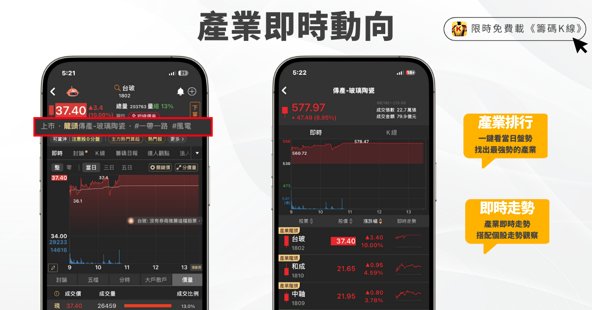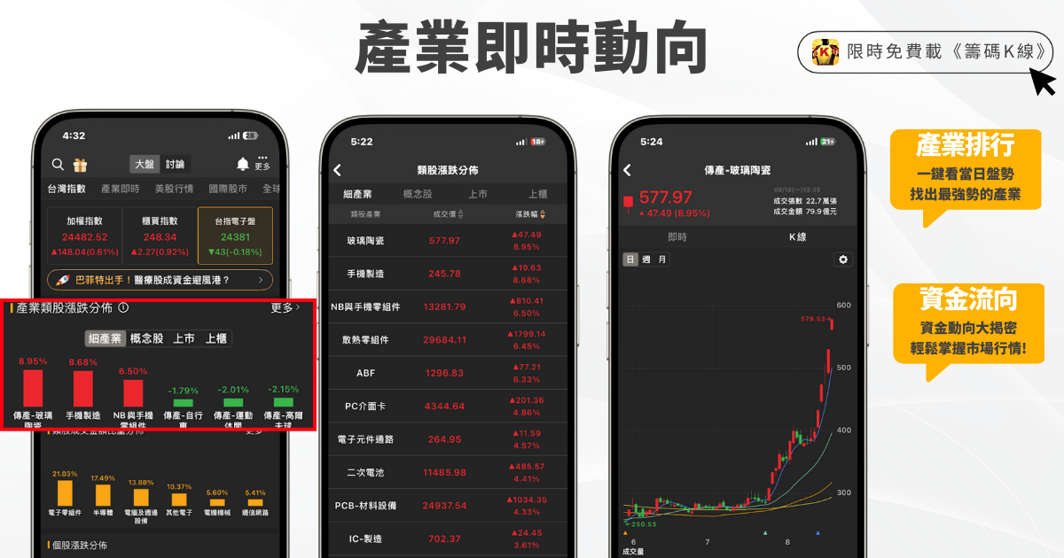 現在就開啟《籌碼K線》- 全台最專業股市分析軟體,觀察最新的產業及時動向,才不會錯過即時行情!