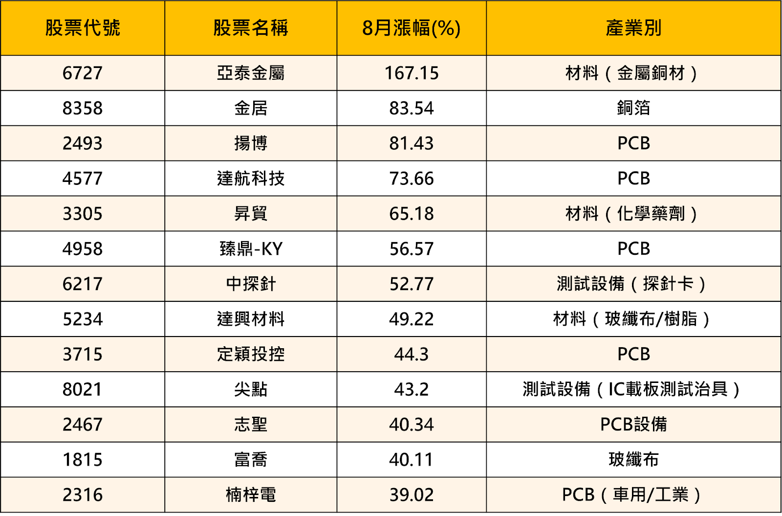 PCB族群八月漲幅排行榜