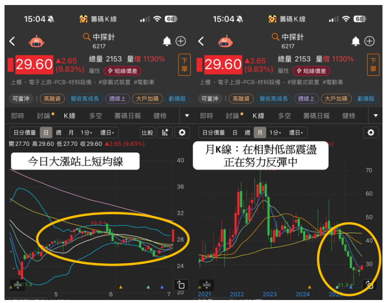 再看到月K線,可以發現中探針(6217)股價在相對低檔震盪,且經過幾個月的黑K棒之後,這個月開始努力反彈中。不過以長周期來說,上方壓力重重,因此要多留意風險。