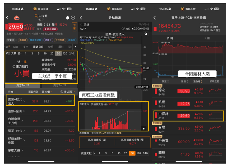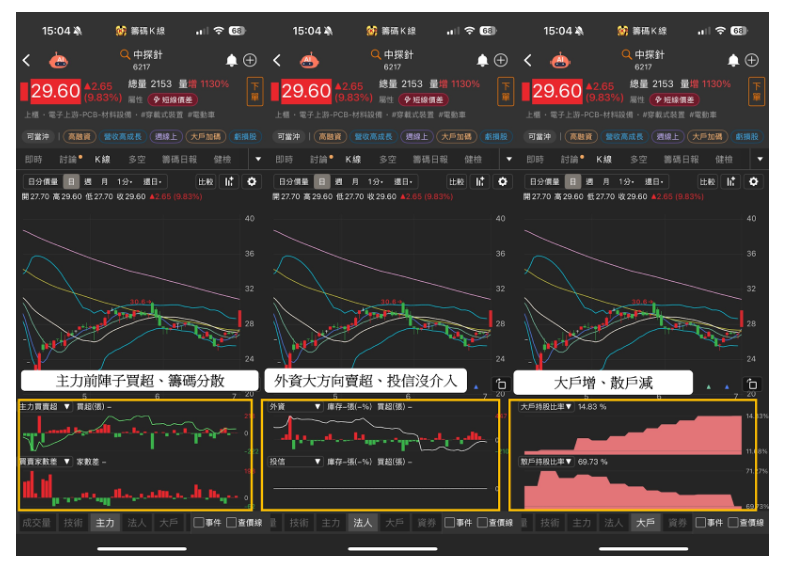 受到短線題材的影響,中探針(6217)今日出現漲停!後續我們要持續觀察,主力、法人是否開始轉為買超,是否有更多的買盤入駐,籌碼是否開始集中,進而向上推升股價。這些指標都是作為後續是否進場持有的參考依據。
