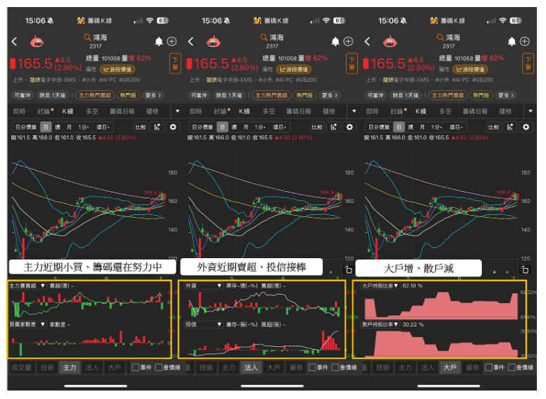 再來我們打開「籌碼K線」,來檢視一下鴻海(2317)整體的籌碼狀況。我們可以看到主力大方向是站在買超方向,不過買賣家數差仍多為正數,代表著籌碼還在努力集中。再看到法人動向,外資大方向整體偏向賣超,不過近期投信接棒進場。並且大戶持股比率在近期呈現出,大戶增加、散戶減少的現象。