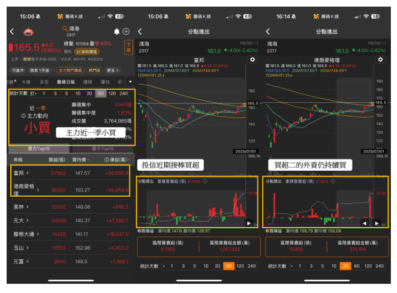 因此從上述籌碼多項指標可以發現,雖然外資近期稍微調節出場,但是其餘主力以及投信都站在買超居多,代表這些主力看好鴻海(2317)的後市表現。後續持續留意,主力是否持續買超,且外資是否回頭來買,是否使籌碼現象往越來越好的方向走。